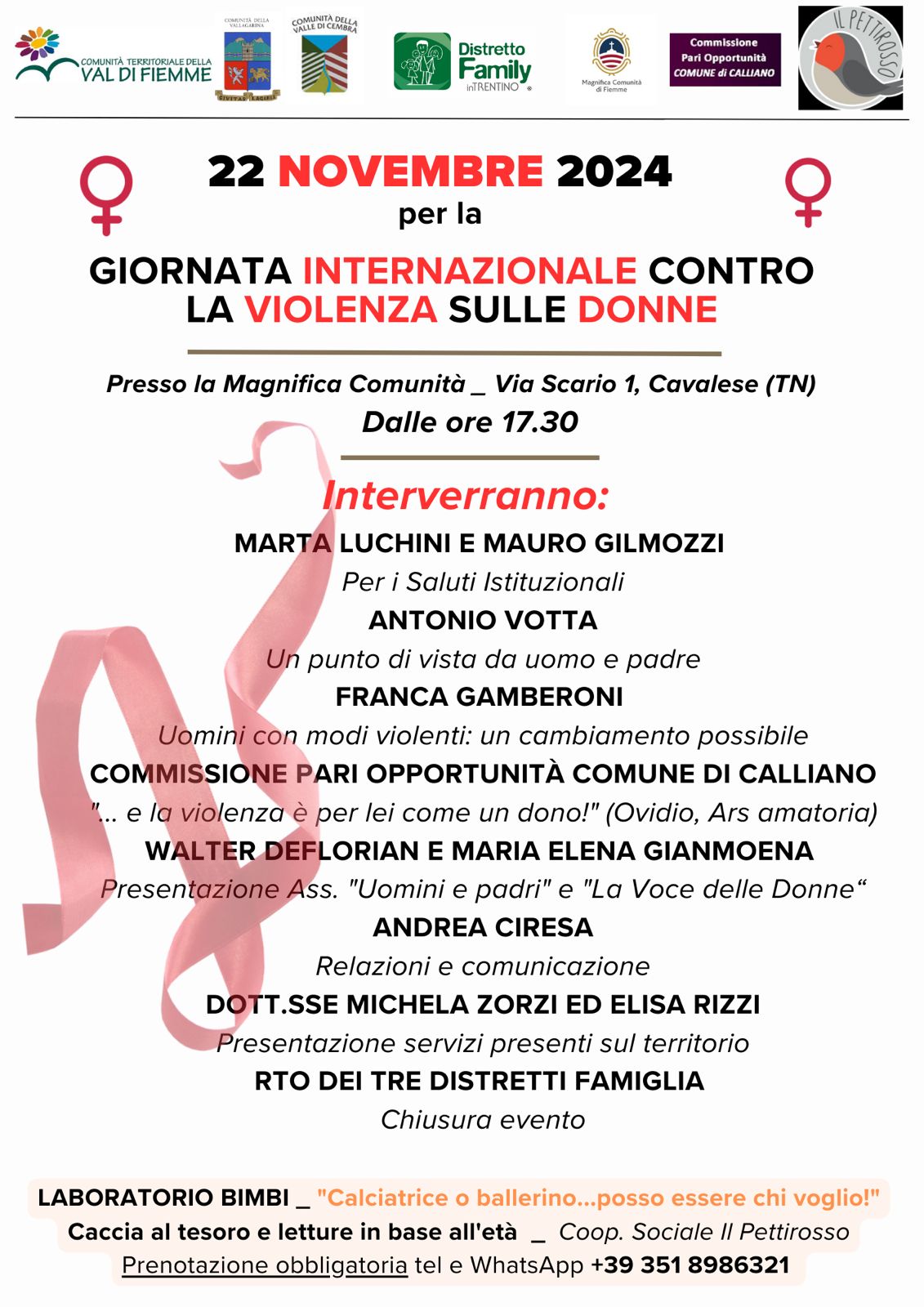 In occasione della giornata internazionale contro la violenza sulle donne il 22 novembre 2024 alle ore 17:30 presso la Magnifica Comunità di Cavalese (via Scario n. 1) si terrà una serata informativa sul tema.