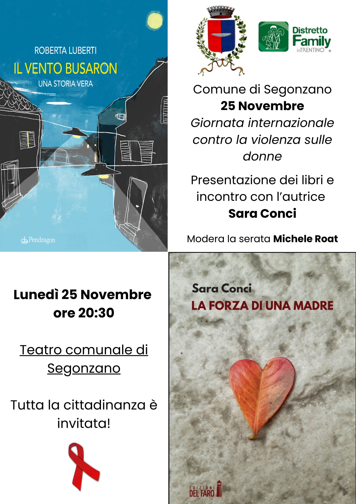 L'Amministrazione comunale organizza lunedì 25 novembre 2024 alle ore 20:30 presso il teatro comunale la presentazione dei libri "Il vento busaron, una storia vera" di Roberta Luberti e "La forza di una madre" di Sara Conci, presente alla serata. Modera l'incontro Michele Roat